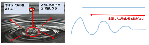 水面に雫が落ちると押される力が働き水紋が広がります。
