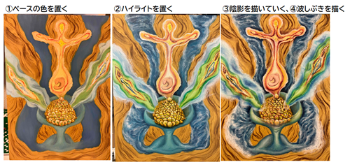 絵の工程として、最初から細かく描き込むのではなく大まかに色を乗せていき徐々に緻密に仕上げていきます。