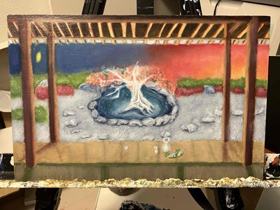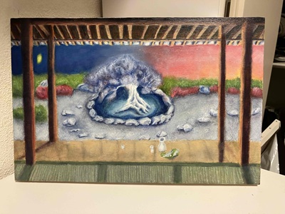 ふわっとイメージはあり、いきなり本番キャンバスに入り勢いつけて描くも途中から迷いタッチ、色選択に悩みモヤモヤしてストレスを溜めていましたね。