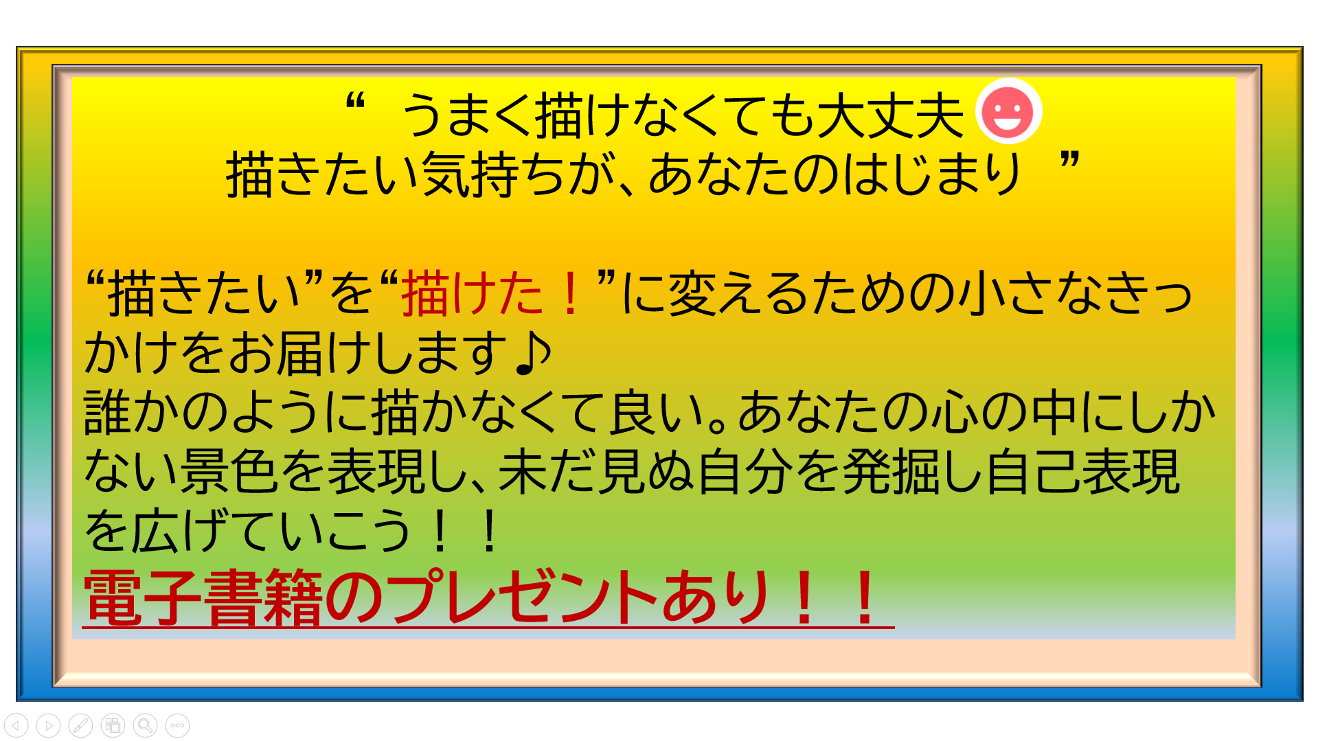 強みも自信もなく自分が嫌いだった状況からも絵を描き始める事で自分にしか出せない存在を生み出し自信へと繋がる。