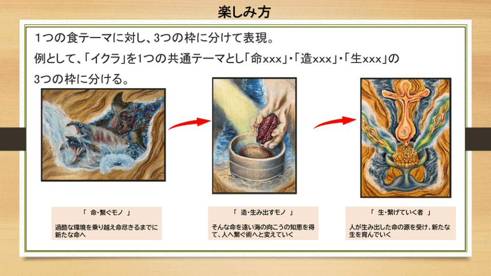 イクラやお酒など食に関わるモノを共通テーマとし、それぞれシリーズ化した作品となります。
