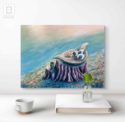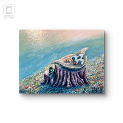 自然を強調する為に切り株と草原を緻密に描き、ゆったり